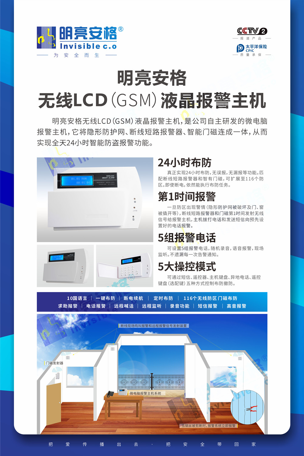 明亮安格智能防盜報警系統(tǒng),是以明亮安格無線LCD(GSM)液晶報警主機,將隱形防護網(wǎng)、無線LC斷線短路報警器、智能門磁組成一個整體,實現(xiàn)全天24小時布防警戒,從而實現(xiàn)全天24小時智能防盜報警功能。它擁有以下幾大功能: