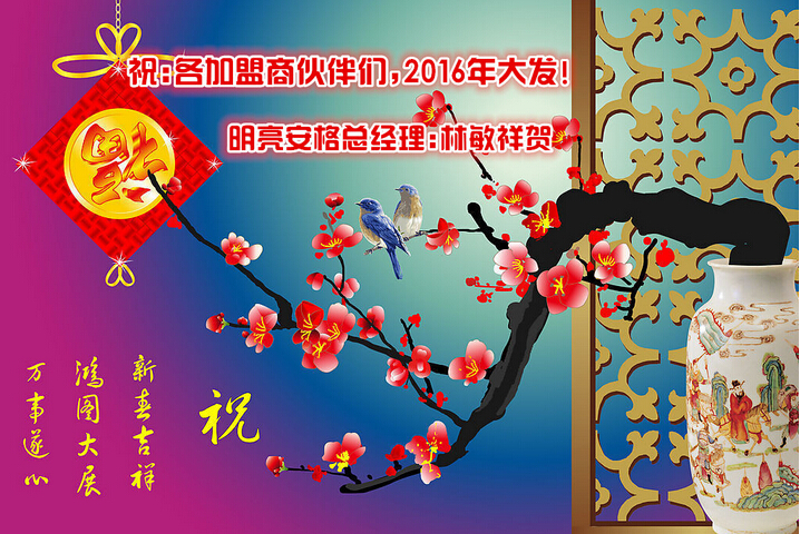 迎新春,賀新年!明亮安格拜早年啦! “2016年春節(jié)”放假通知 一年一度的春節(jié)到了,公司祝全國明亮安格成員們2016年節(jié)日快樂、財源廣進、平安健康!公司2月1日開始放假,2月23正常上班,放假期間網站正常開放,放假期...